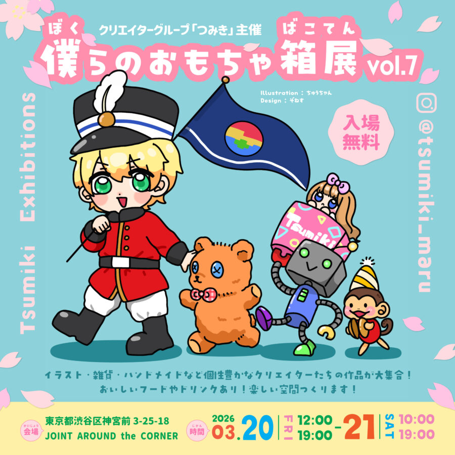 つみきが主催する「僕らのおもちゃ箱展」は、どなたでも皆様の"好き"を表現していただけるイベントです。過去展示作品は、イラスト・アパレル・グッズ・アクセサリー・写真など…多岐に渡ります。皆様の後押しをするお手伝いができたらなと思っています。些細なことでもお気軽にご相談ください!